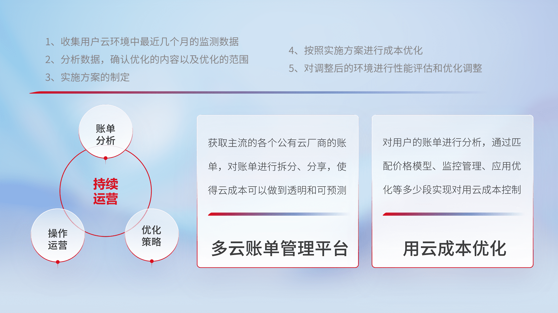 通过多云纳管,,以统一的资源数据模型把客户的云资源进行抽象和封装,,,,进而实现对多云资源的统一操作,,保障云资源管理的可靠性、、、、稳定性与可用性。。。量身定制化运维内容,,,配置、、、开发运维、、、、补丁管理、、备份、、、监控、、认证和访问管理、、、审计和日常巡检等,,保障在用云过程中的可靠度,,稳定度以及高可用率。。。。