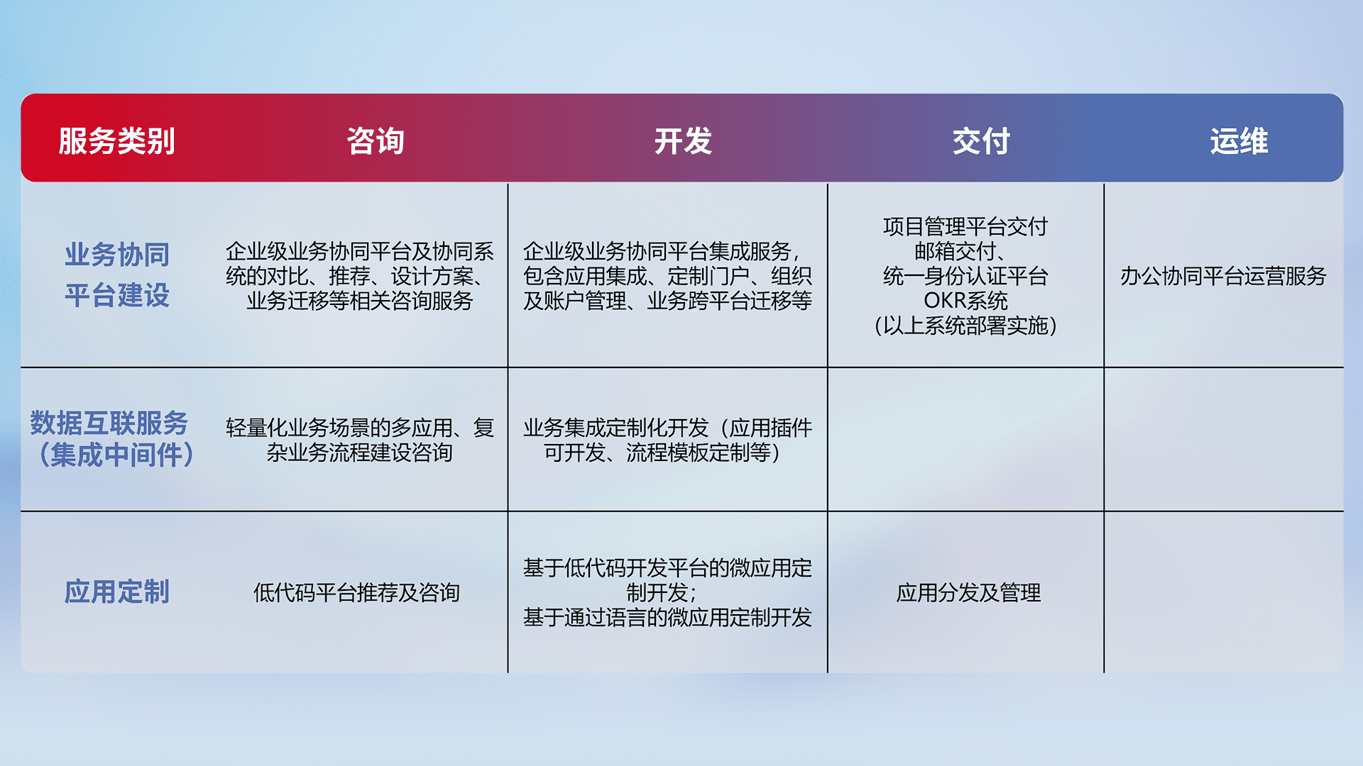 针对钉钉、、、、企微、、IDaas等平台级产品提供产品的规划、、、、方案、、、交付、、、定制化开发等服务,,,实现如统一协同办公、、智能客户服务、、、、混合会议管理、、、、智能数据查询、、、、等业务场景,,实现数字化转型。。。